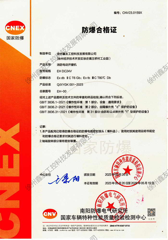 徐州鑫友工控科技發(fā)展有限公司成立于2008年,占地31600平方米,全資子公司:江蘇良紫工程科技有限公司,旗下 有“鑫友”及“MASTER.W主人窗控”兩個(gè)品牌系列,公司全面貫徹執(zhí)行IS09001:2015質(zhì)量管理體系標(biāo)準(zhǔn),產(chǎn)品順利通過(guò)歐盟CE認(rèn)證和中國(guó)***消防電子產(chǎn)品認(rèn)證,通過(guò)可燃性粉塵環(huán)境下、爆炸性環(huán)境下防爆合格產(chǎn)品檢驗(yàn)。排煙天窗整窗通過(guò)***消防產(chǎn)品質(zhì)量監(jiān)督檢驗(yàn)中心檢測(cè)。先后獲得多項(xiàng)******及榮譽(yù)證書(shū)。集研發(fā)、加工、生產(chǎn)、制造、銷(xiāo)售、安裝及售后于一體,是一家高起點(diǎn)、研發(fā)能力強(qiáng)的專(zhuān)業(yè)智能化企業(yè)。