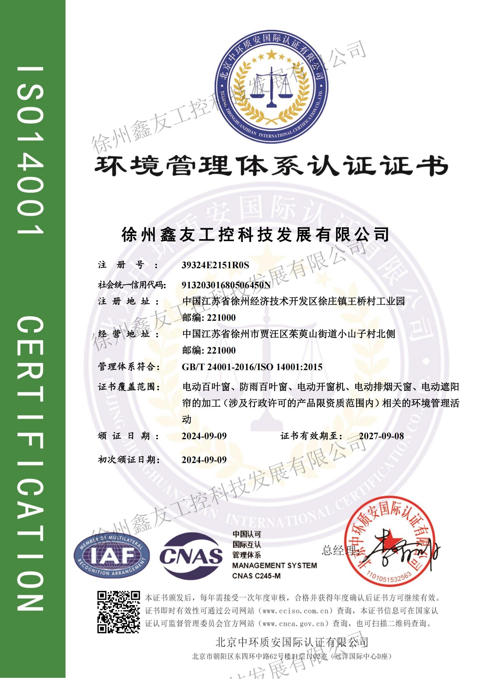 環(huán)境管理體系認證證書